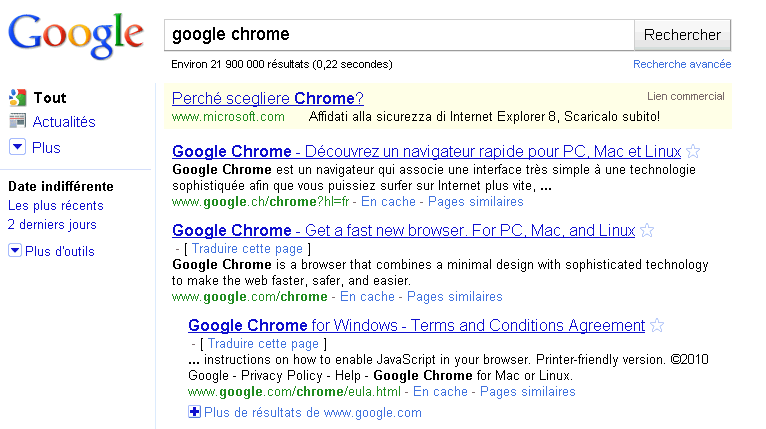 Là aussi il ne faut pas se le cacher, Google a réussi à innover en débarquant avec Chrome, directement sur les trois plateformes Windows, Mac et GNU/Linux. Sécurité, interface épurée (fidèle à la tradition Google), affichage fluide et agréable, onglets indépendants, moins gourmand en ressources, une très pratique recherche à même la barre d’adresses, la présence d’extensions dans la dernière version… et puis cet argument massue : la rapidité.
