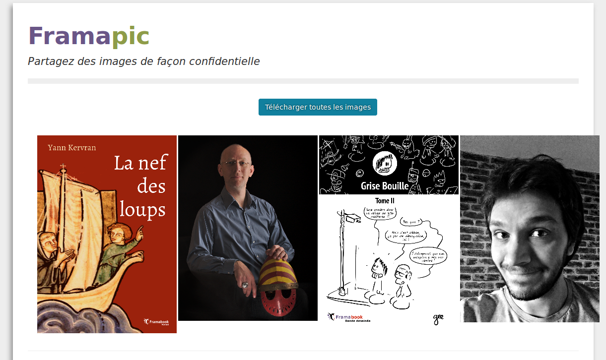 Pouhiou veut rassembler les images des deux derniers Framabooks (La Nef des Loups, et Grise Bouille Tome 2) et de leurs auteurs dans une galerie. Il sait qu’il a déjà envoyé la couverture de Grise Bouille et la photo de son auteur, Gee, sur Framapic. Il commence donc par ajouter les fichiers de La Nef des loups : la couverture du livre et la photo de Yann Kervran, son auteur.