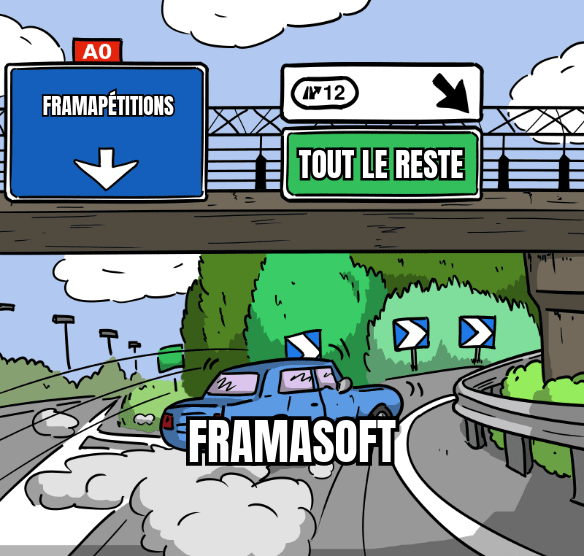 Mème : sur l'autoroute, un panneau indique « Framapétitions » tout droit et « Tout le reste » sur la sortie à droite. Une voiture taguée « Framasoft » fait un dérapage pour prendre la sortie.