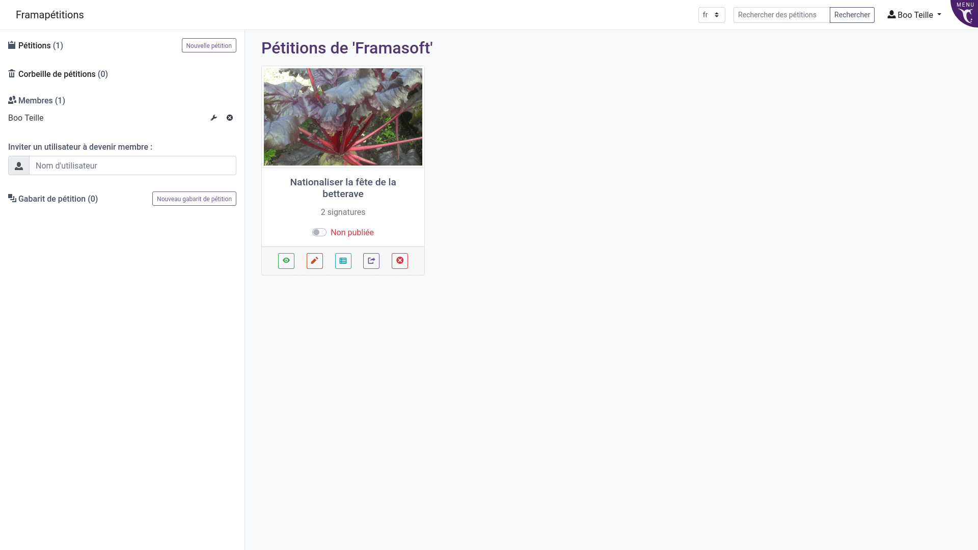 Capture d'écran de la page d'accueil de l'organisation "Framasoft".À gauche, le menu indique le nombre de pétitions et la corbeille de pétitions. Un bouton "Nouvelle pétition" est aussi disponible. Dessous, la liste des membres et la possibilité d'ajouter un nouveau membre. Encore en dessous, le nombre de gabarits de pétitions et le bouton "nouveau gabarit de pétition". Le contenu principal montre les pétitions de Framasoft. Ici, la seule pétition disponible est "Nationaliser la fête de la betterave".