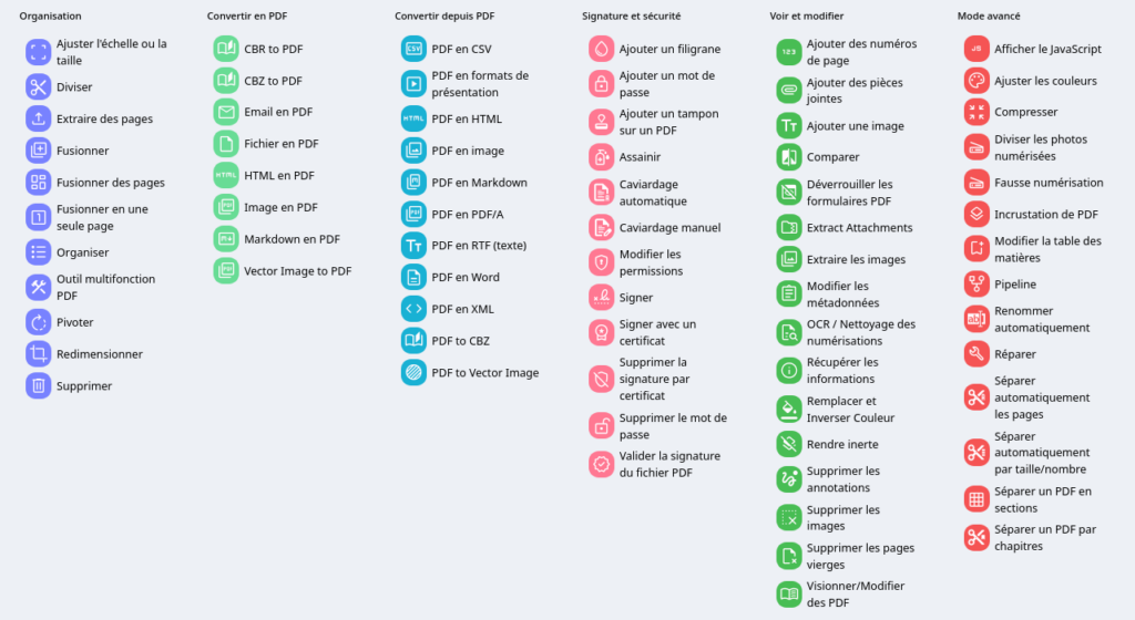 Si vous vous sentez plus à l’aise à manipuler les fichiers PDF, vous pouvez aussi utiliser la version avancée (qui utilise pour le moment Stirling PDF, mais dont le changement de licence en open-core nous enjoint à passer prochainement à Bento PDF – mais les fonctionnalités seront sensiblement identiques) :