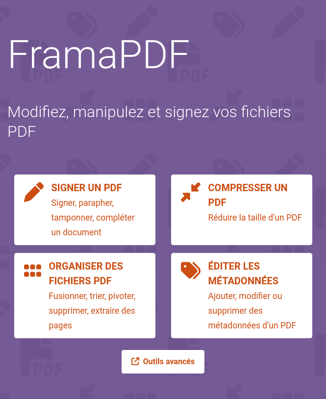 Nous aurions pu laisser FramaToolbox faire tout le boulot mais avec vos retours pendant les tests (quand le logiciel était sur le banc d’essai Framalab) et le fait que les PDF aient envahi nos vies administratives, on s’est dit qu’un service dédié ne serait pas de trop.