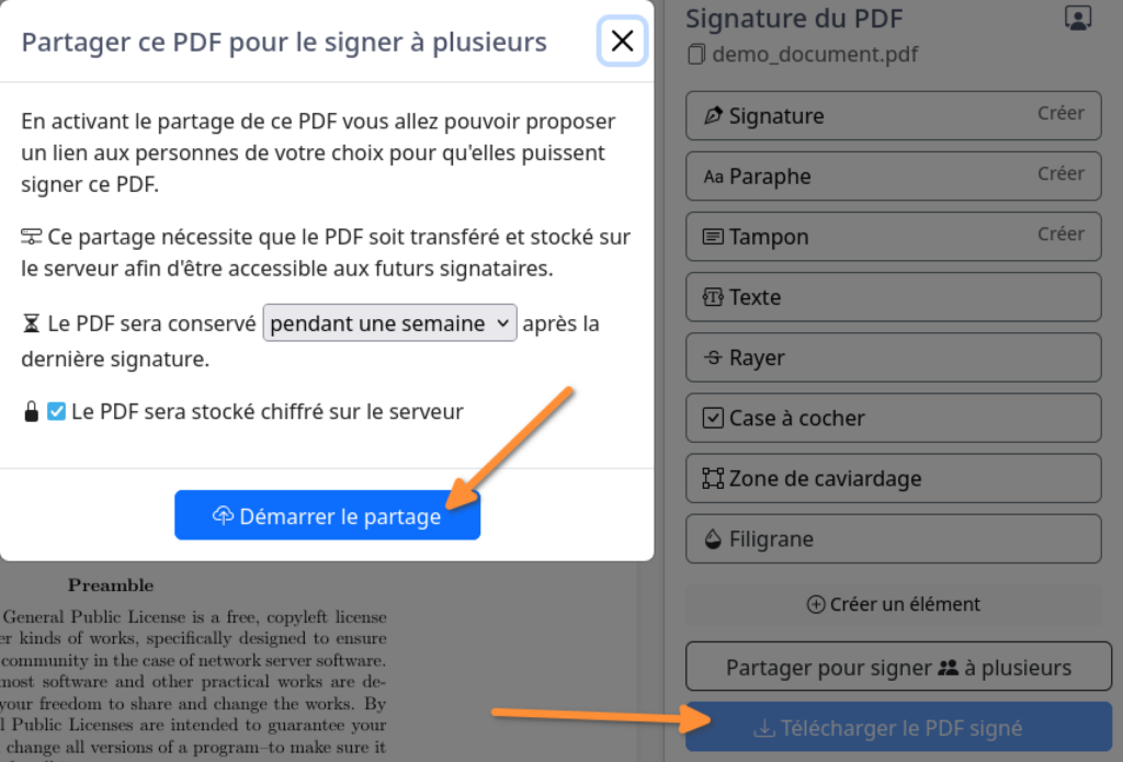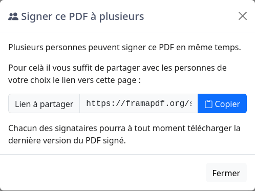 Si vous êtes plusieurs à devoir signer un même document, vous pouvez partager le lien du PDF en cliquant sur Partager pour signer à plusieurs puis sur Démarrer le partage. Vous pourrez ainsi copier le lien à partager avec les autres personnes devant signer.