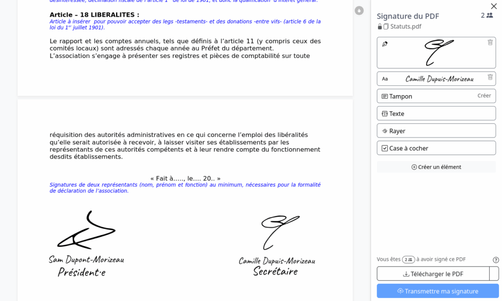 En cliquant sur le bouton Transmettre ma signature vous la ferez apparaître pour les autres personnes à qui vous avez donné le lien, qui pourront donc ajouter la leur à côté de la votre.