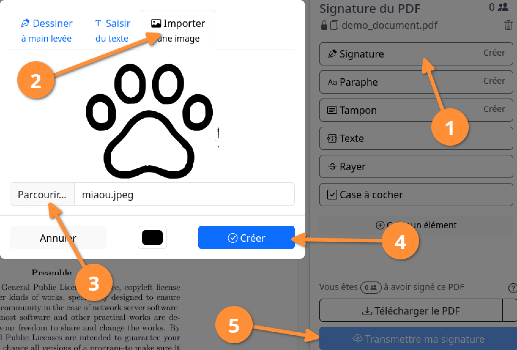 - importer une image (d’une signature faite sur papier et numérisée, par exemple)