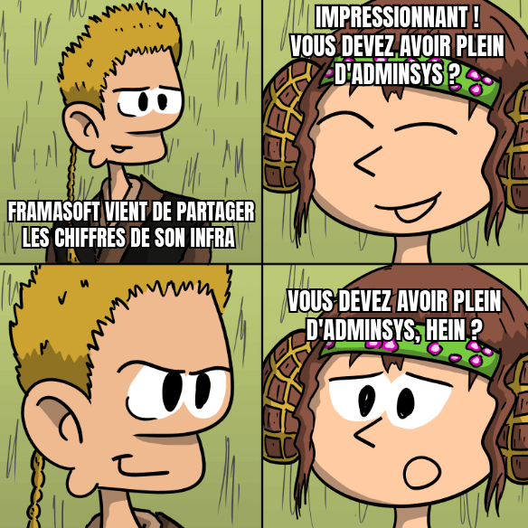 - 1 personne en administration systèmes, pour gérer les différents serveurs et services (oui oui, cette personne est un peu le coeur de Framasoft)